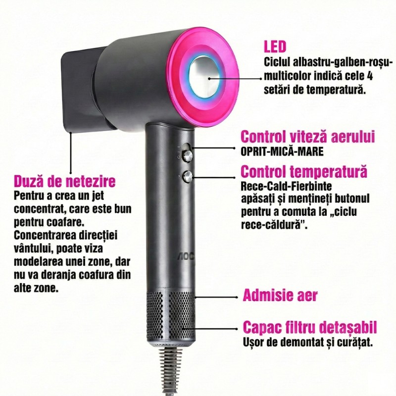 • motor puternic de mare viteza cu 110000 rpm ce asigura un flux de aer rapid de 24m/s